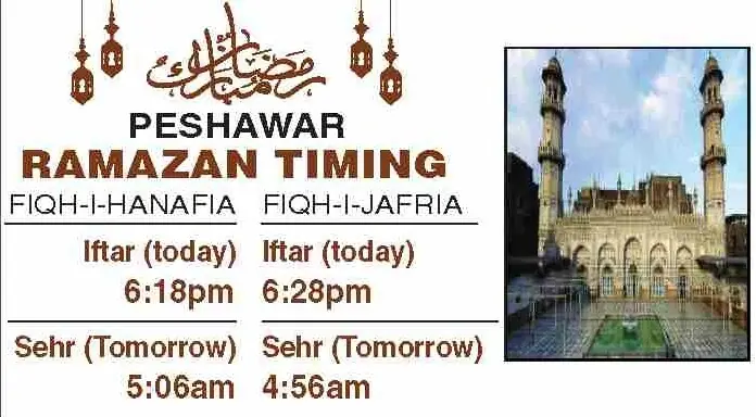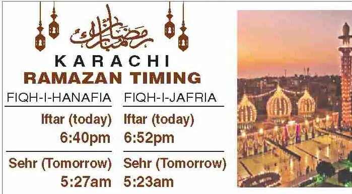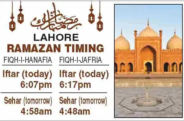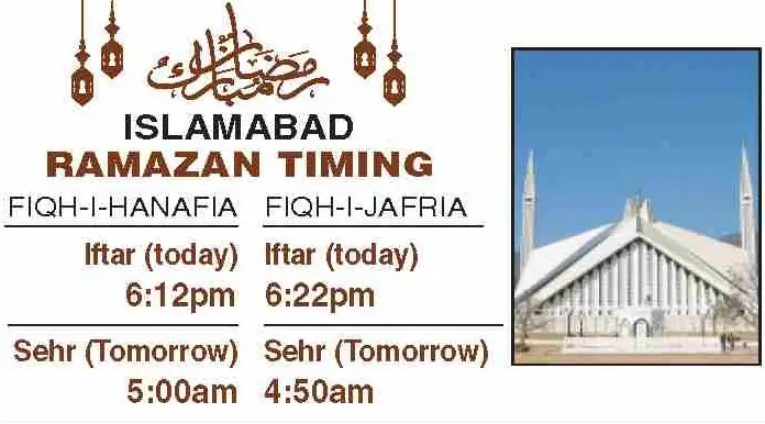 Times for today’s Iftar (Ramazan 20) and tomorrow’s Sehri (Ramazan 21) for the federal and provincial capitals are listed below: